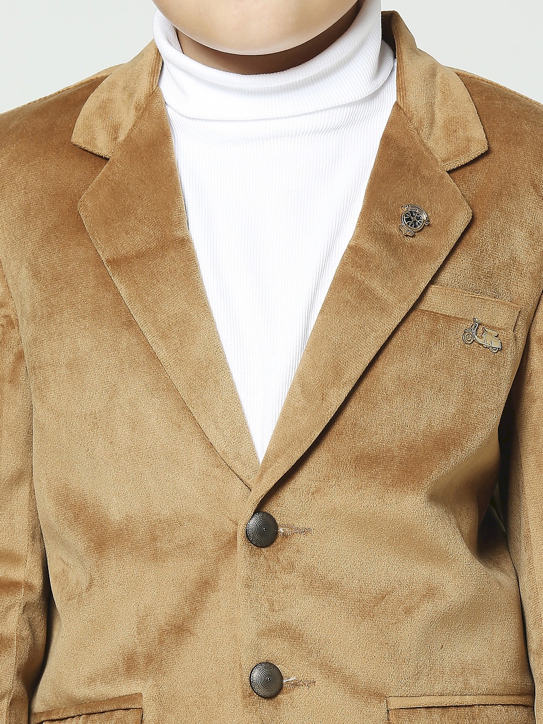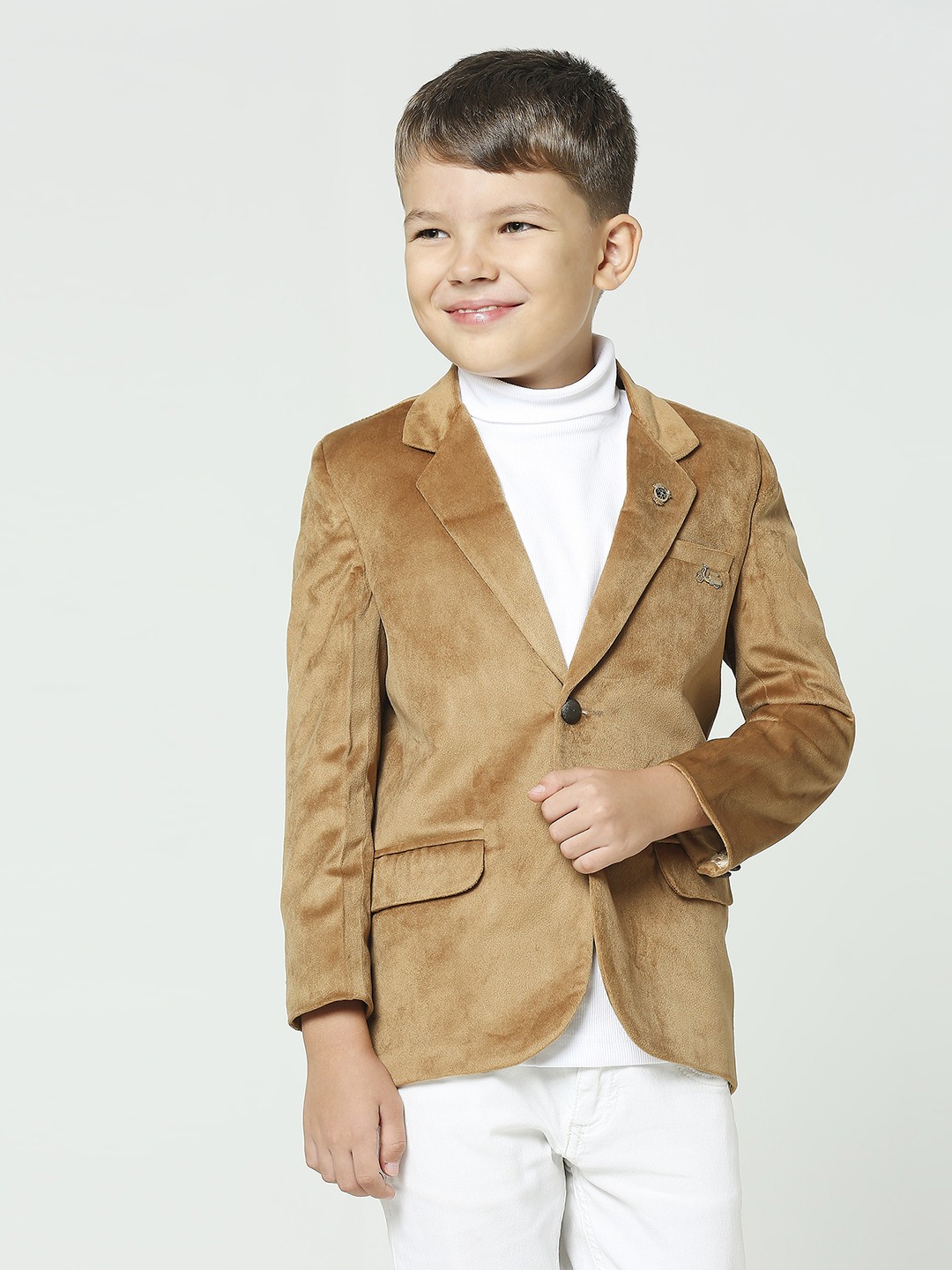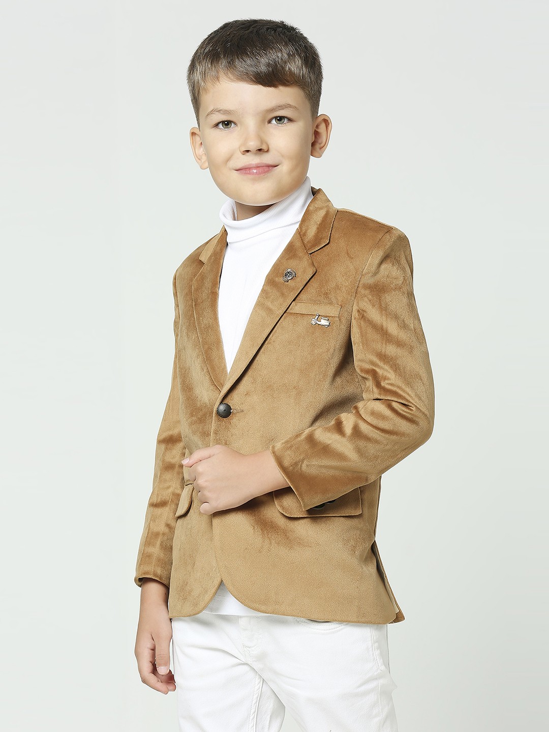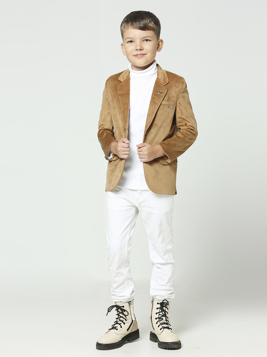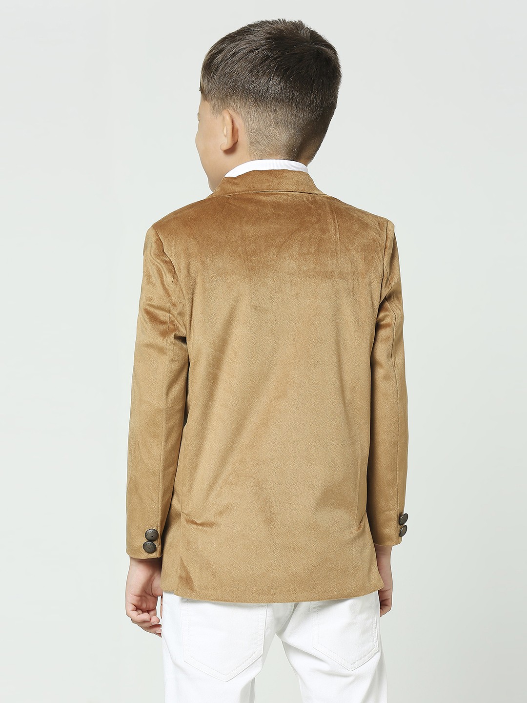\"Introducing our Boys Fawn Suede Velvet Blazer – a luxurious statement piece for the young trendsetter. Elevate his style with this opulent blend of sophistication and comfort.